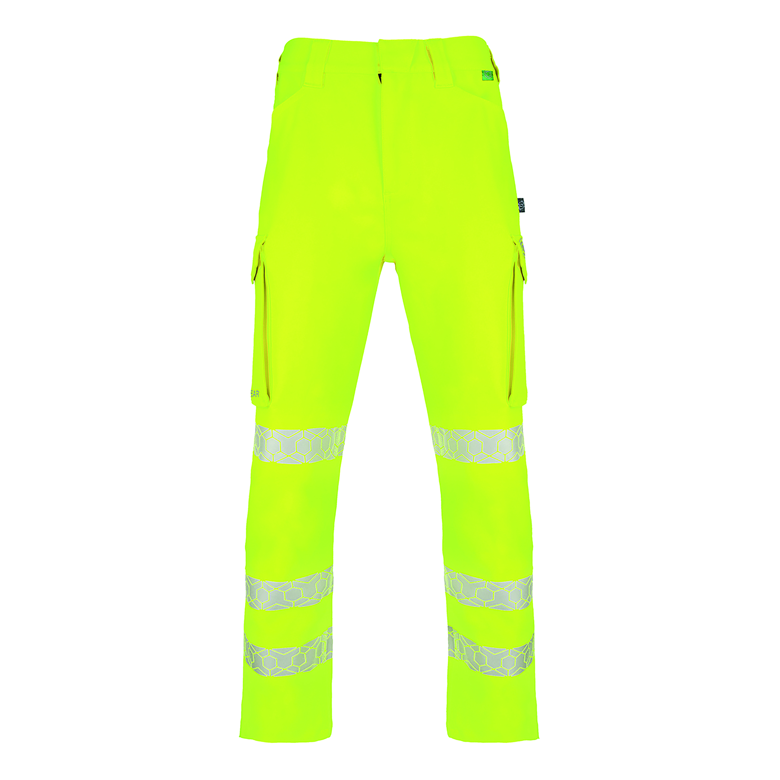 A clothing revolution is changing the way garments are made and how wearers interact with brands. Envirowear has been designed to be recycled using only mono-fibre design principles, each fabric, trim and accessory is carefully selected to ensure recyclability. Once garments reach the end of their useful lives, they are returned for recycling. The rPet generated from this unique recycling process can be made into yarn and used in all kinds of polyester clothing and accessories. 240gsm 100% polyester twill fabric Manufactured using 100% GRS Certified polyester yarns Durable hard wearing whilst remaining soft and comfortable Triple sewn seams for extra strength 7 Belt loop waistband 2 x cargo pockets Hex patterned heatseal Retro-Reflective tape for comfort and flexibility. Tall and short leg option available Conforms to EN ISO 20471 Class 2 High Visibility RIS-3279-TOM - Railway use certified.